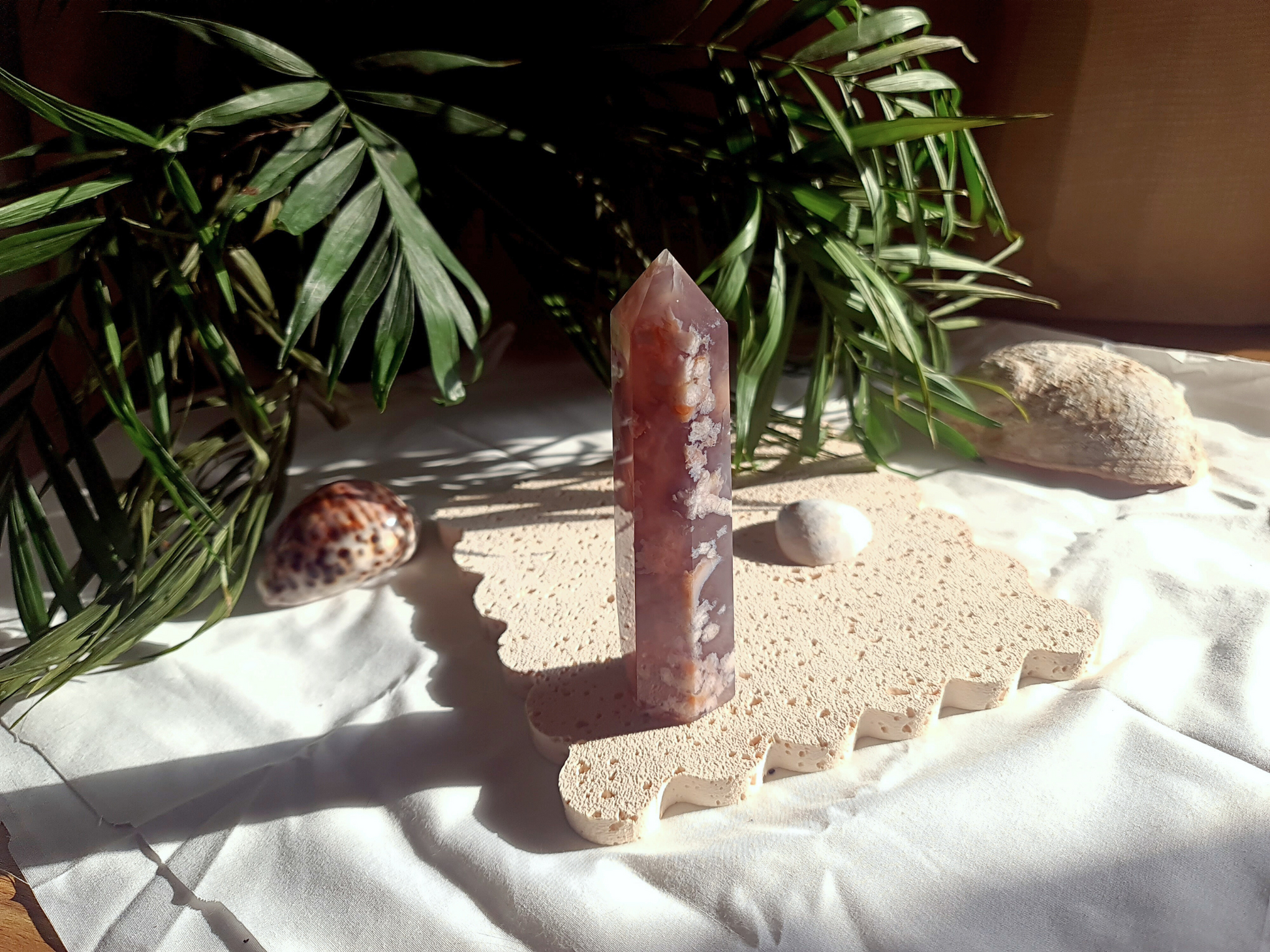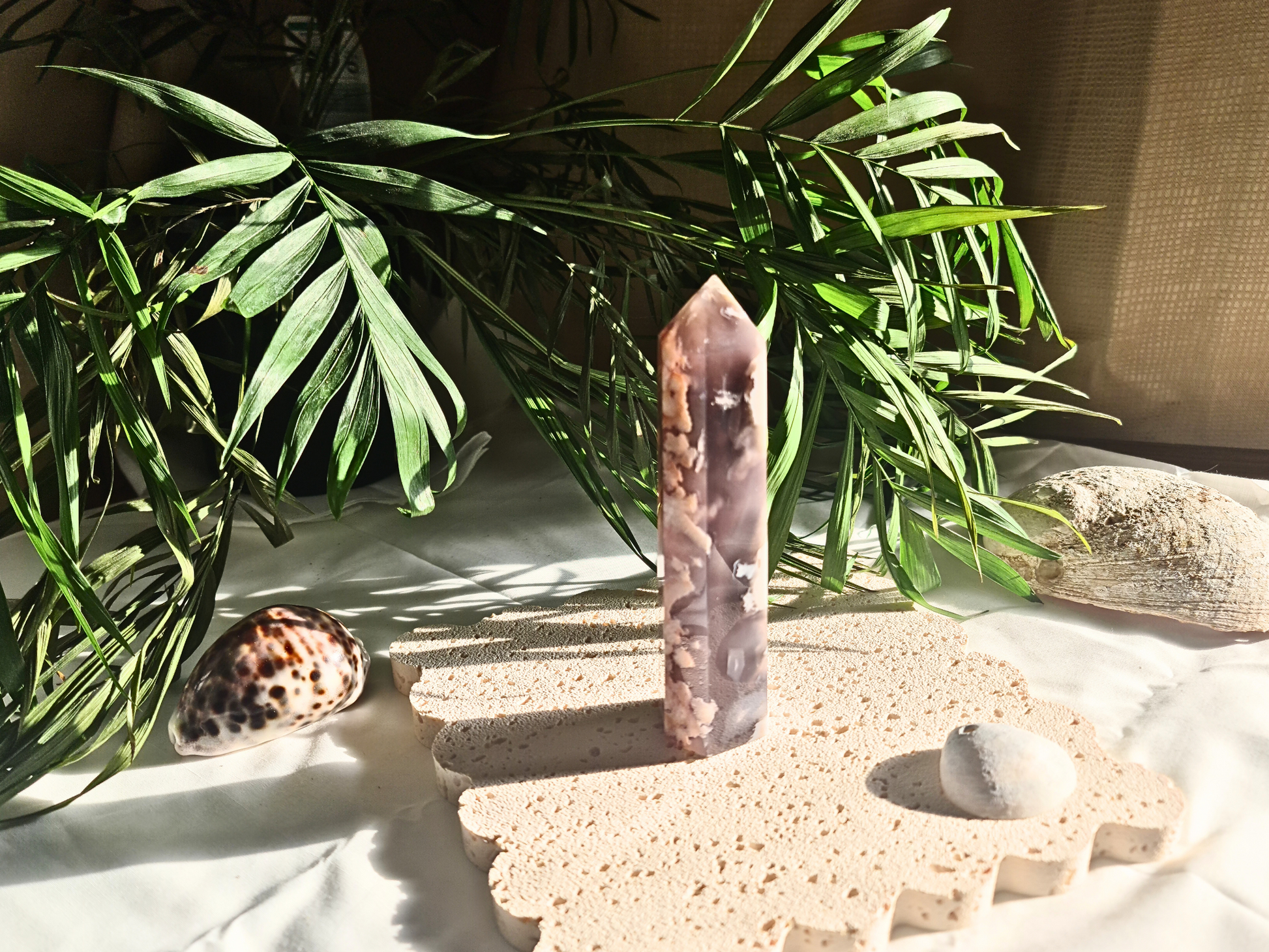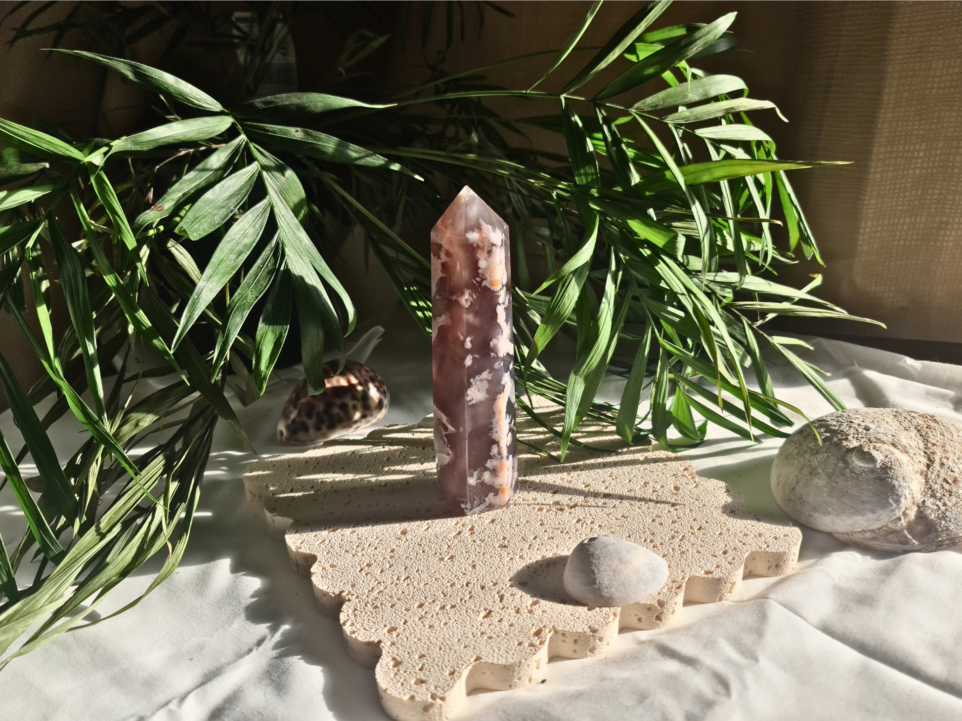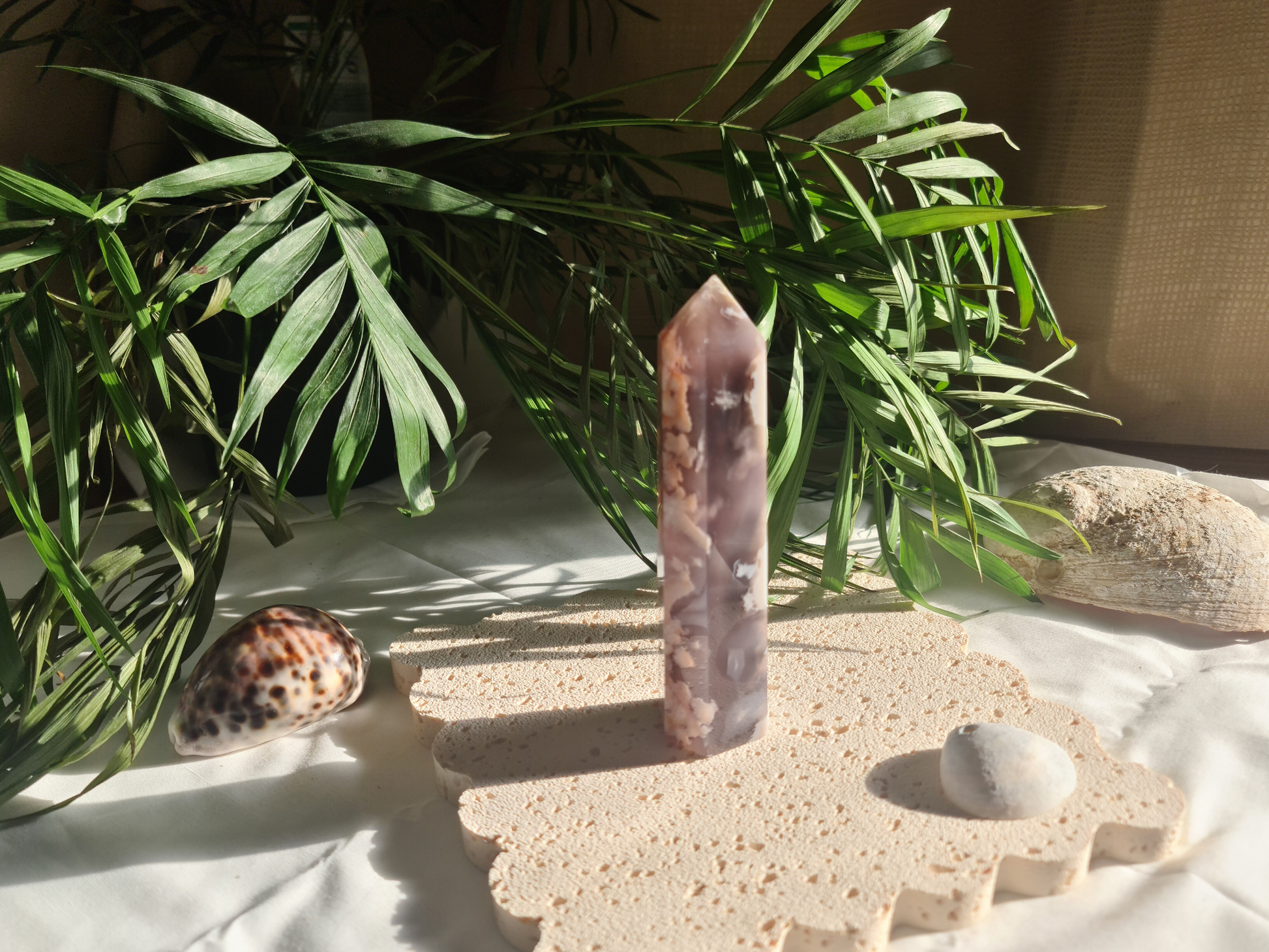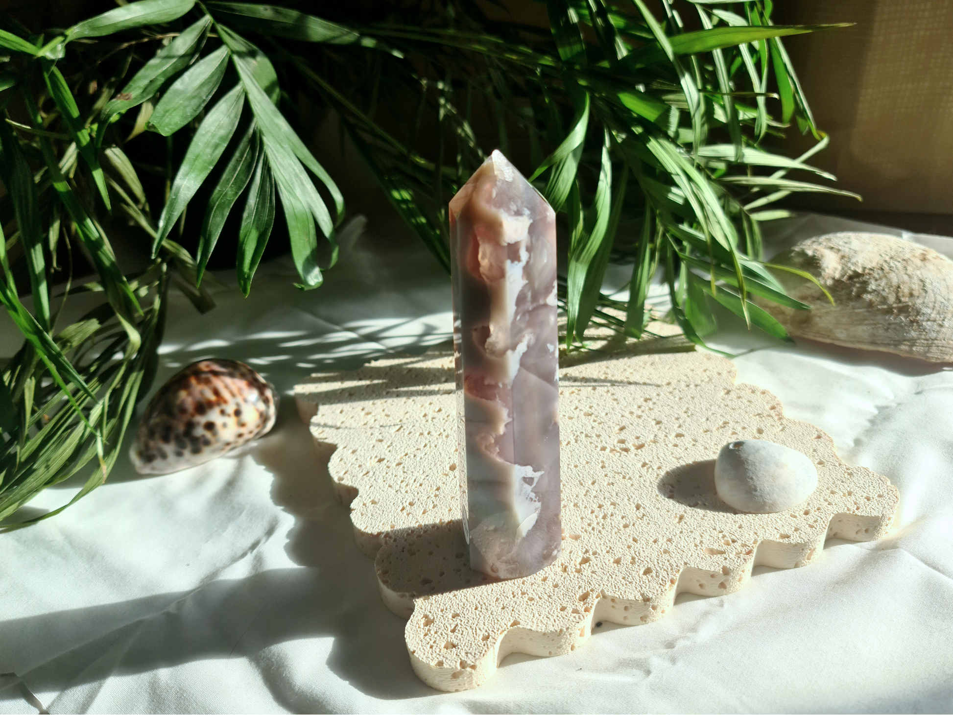 Flower Agate, with its delicate floral patterns and gentle energy, indeed has a strong association with enhancing feminine qualities and connecting to the divine. When combined with Hematite and Basalt inclusions, it gains additional properties that bolster its grounding and protective effects.