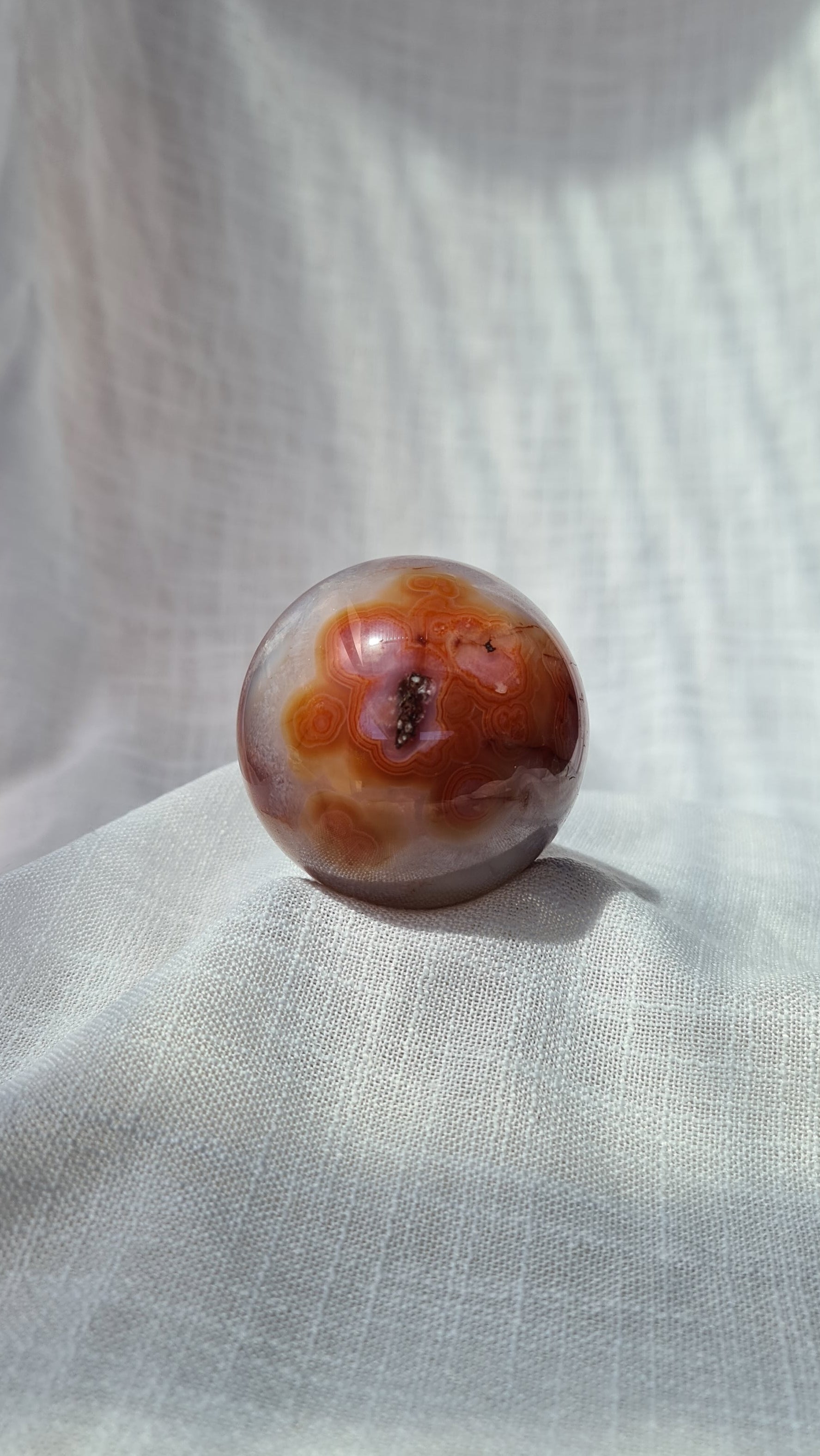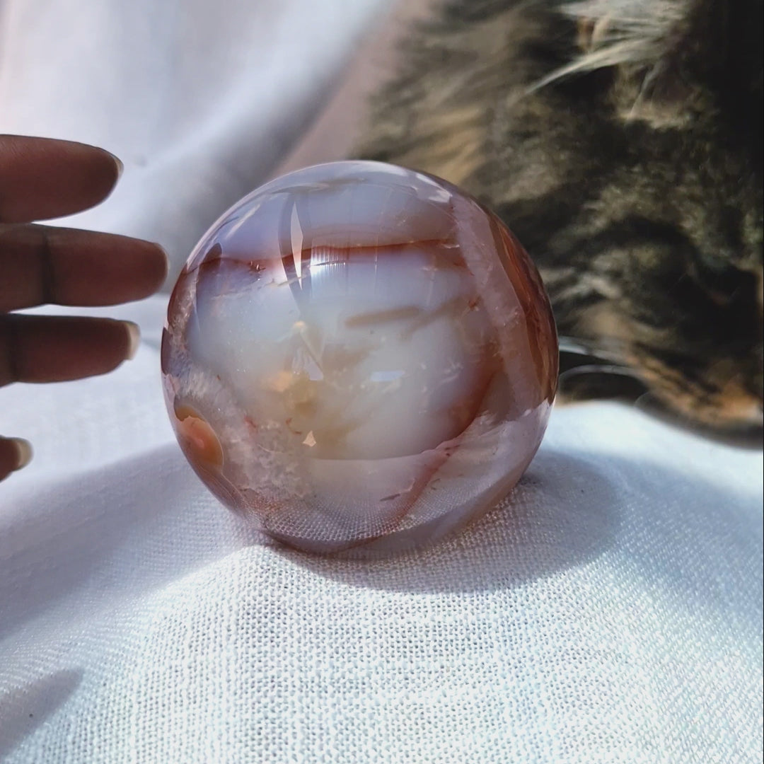Carnelian flower Agate is a type of chalcedony with the reddish-brown colour from the iron impurities within the stone. The “flower agate” is the opaque white chalcedony within the mineral that looks like plumes/flowers.