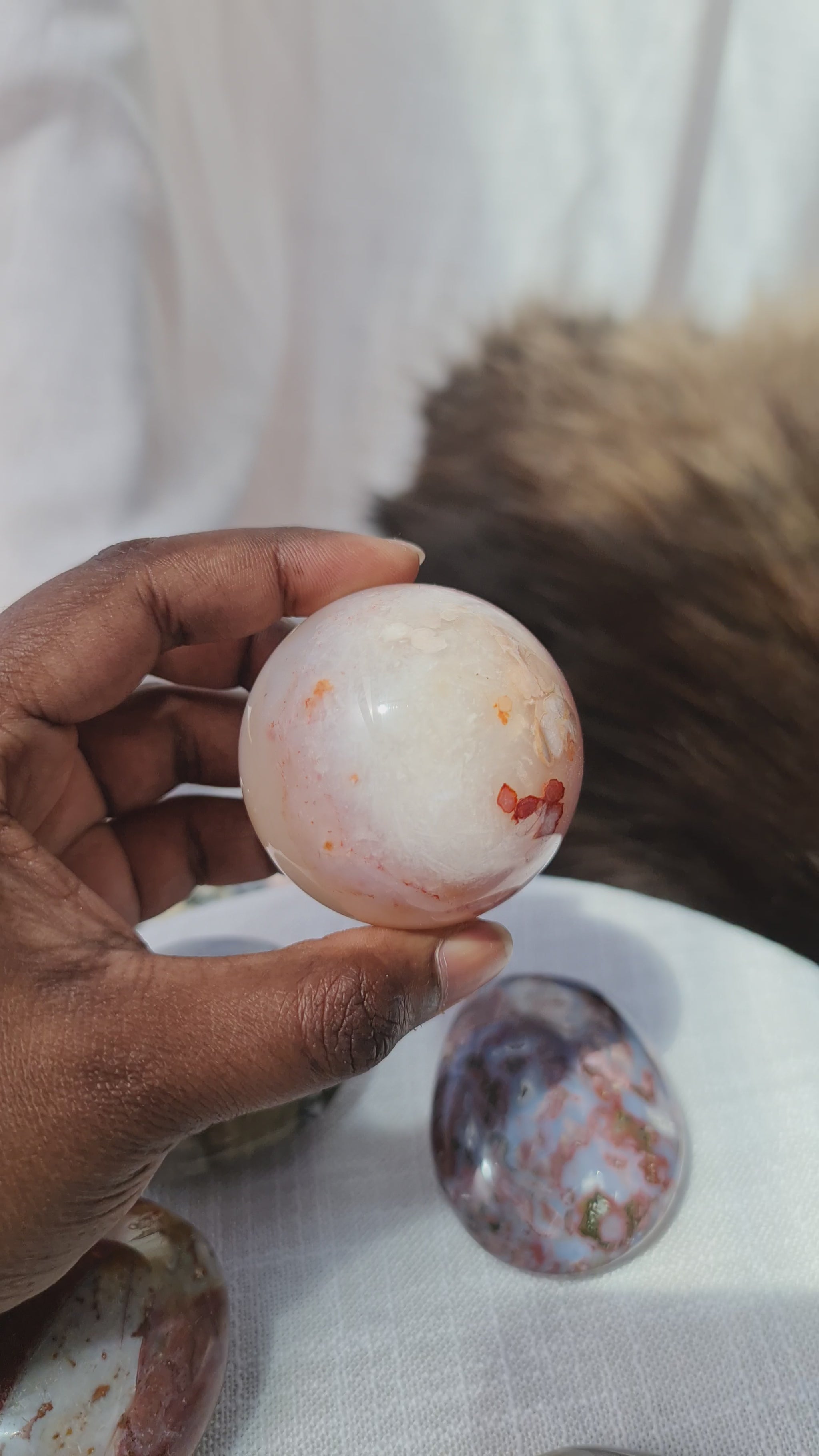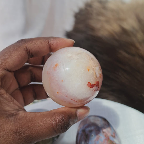 Carnelian flower Agate is a type of chalcedony with the reddish-brown colour from the iron impurities within the stone. The “flower agate” is the opaque white chalcedony within the mineral that looks like plumes/flowers.
