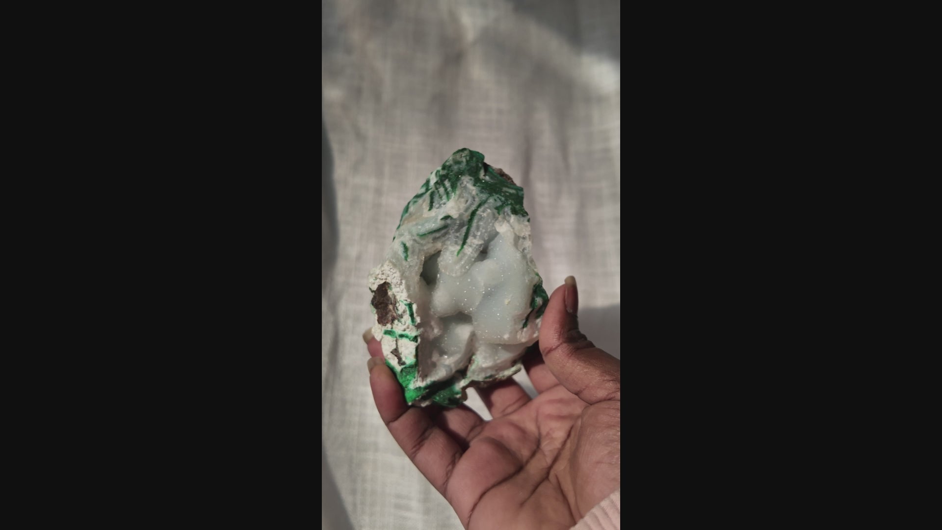 This specimen piece features a harmonious blend of chalcedony, malachite, and quartz, each contributing unique textures and colors.