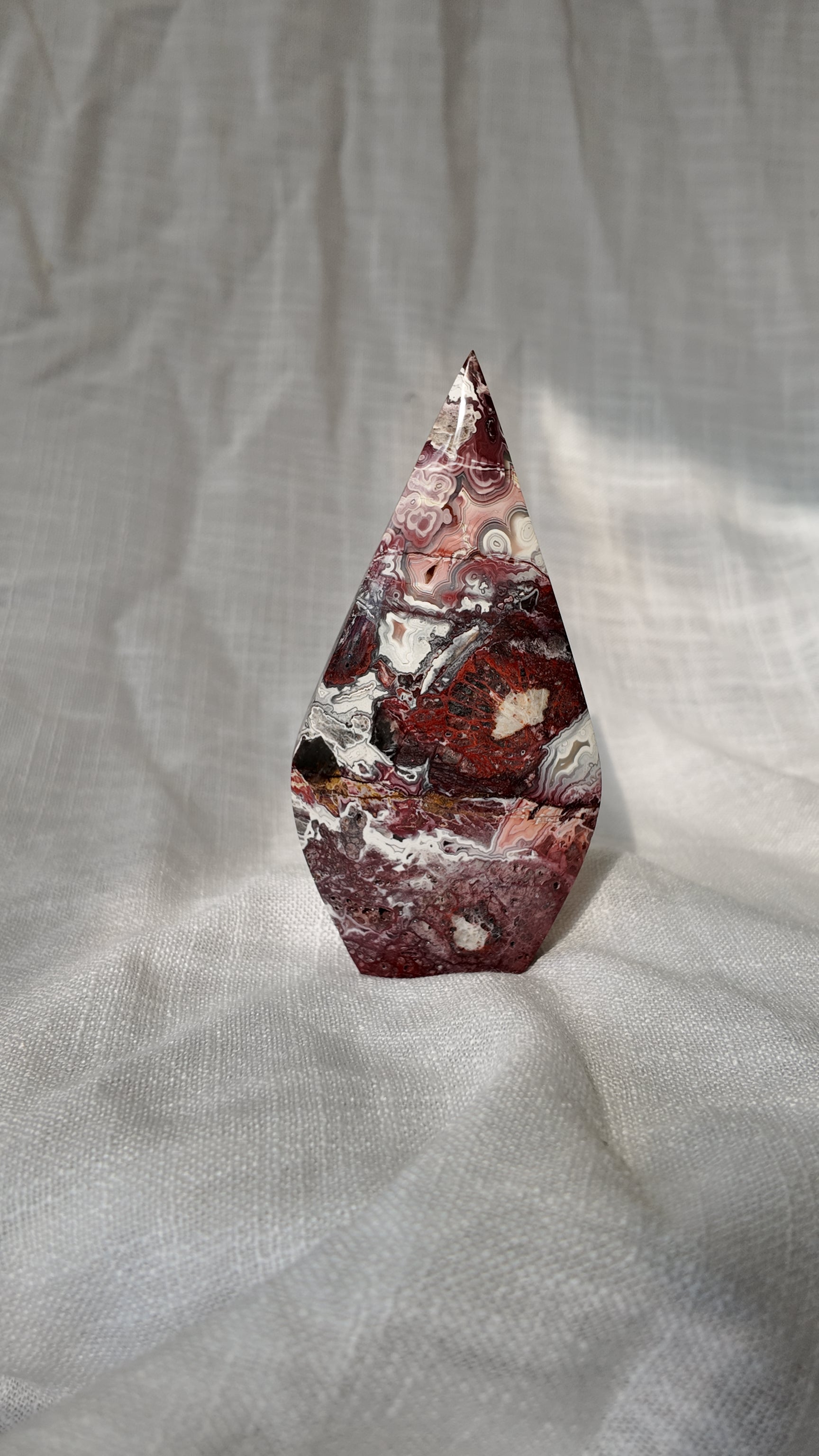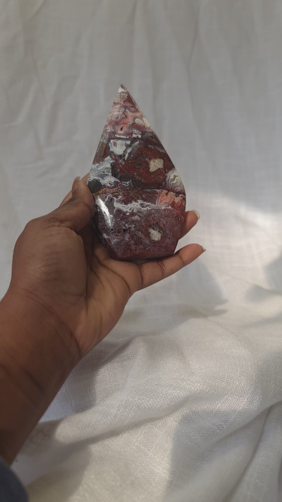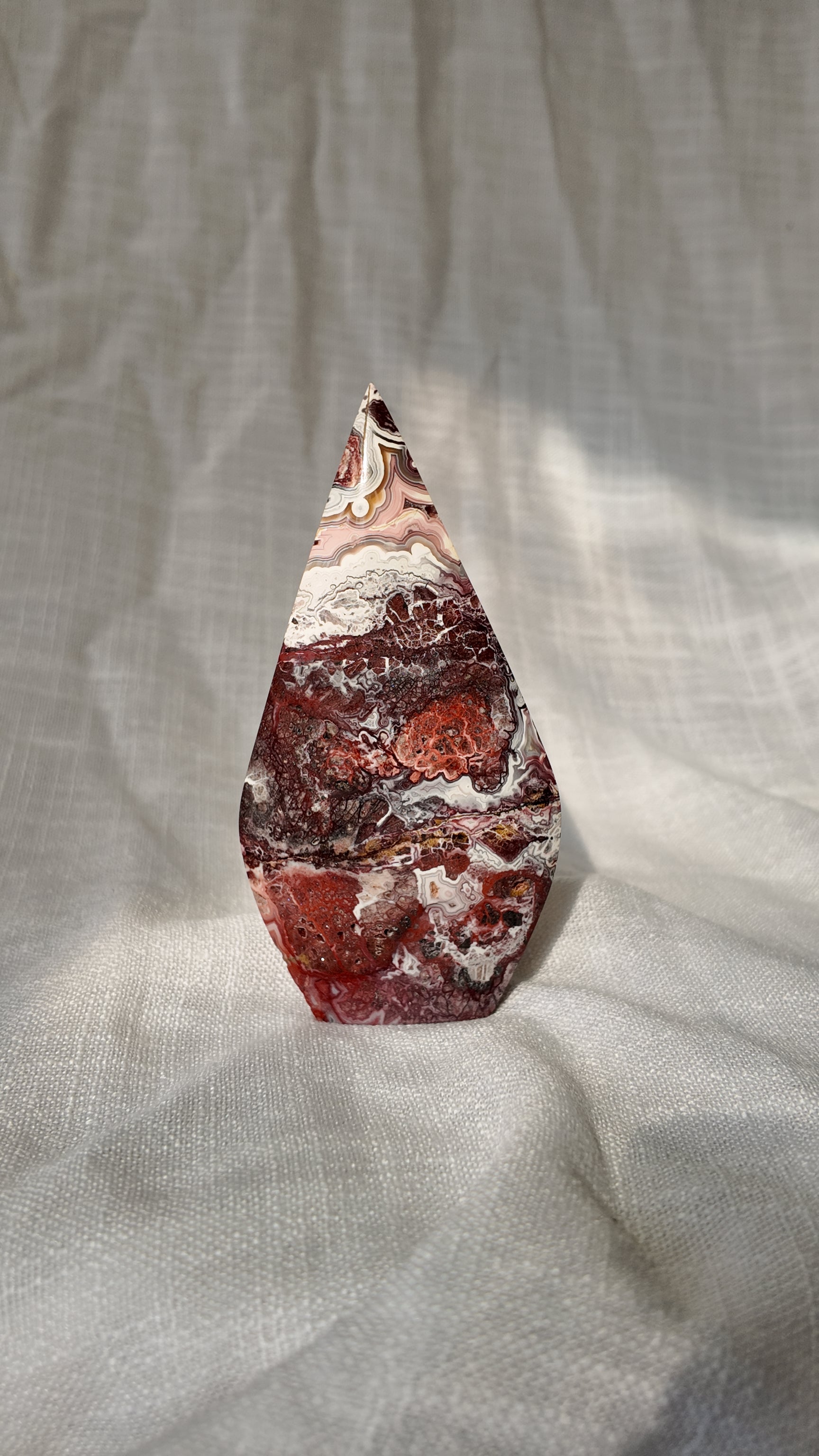 Mexican agate aka Crazy Lace Agate, often called the ‘laughter stone,’ is a variety of banded chalcedony prized for its intricate swirling patterns. It forms when silica-rich solutions slowly deposit in cavities of volcanic rock, creating winding bands of reds, creams, greys, and golds. The striking lace-like designs come from trace minerals such as iron and aluminum, which infuse the agate with its vivid palette. Each piece is a miniature canvas of twisting lines and layers, making Crazy Lace Agate one of the most visually dynamic and unique varieties of agate found in nature.