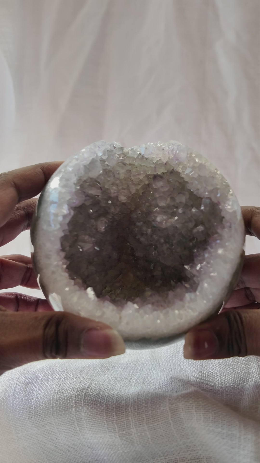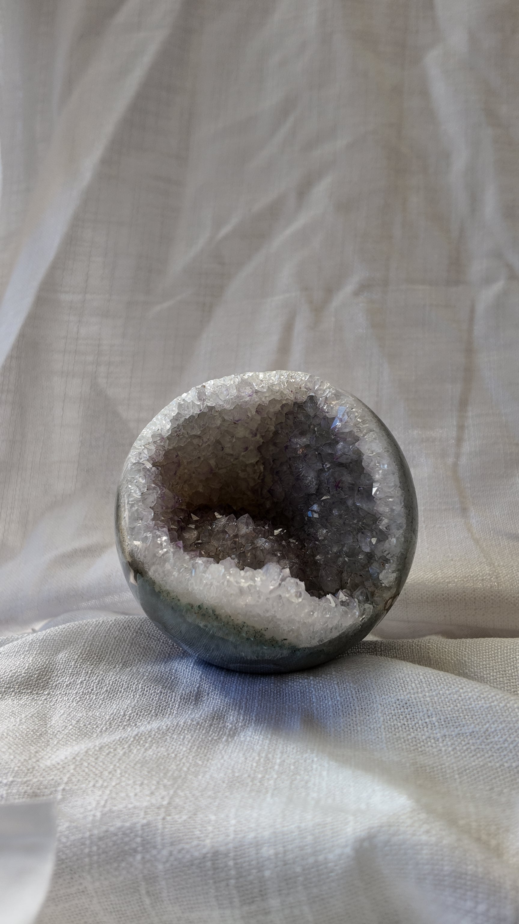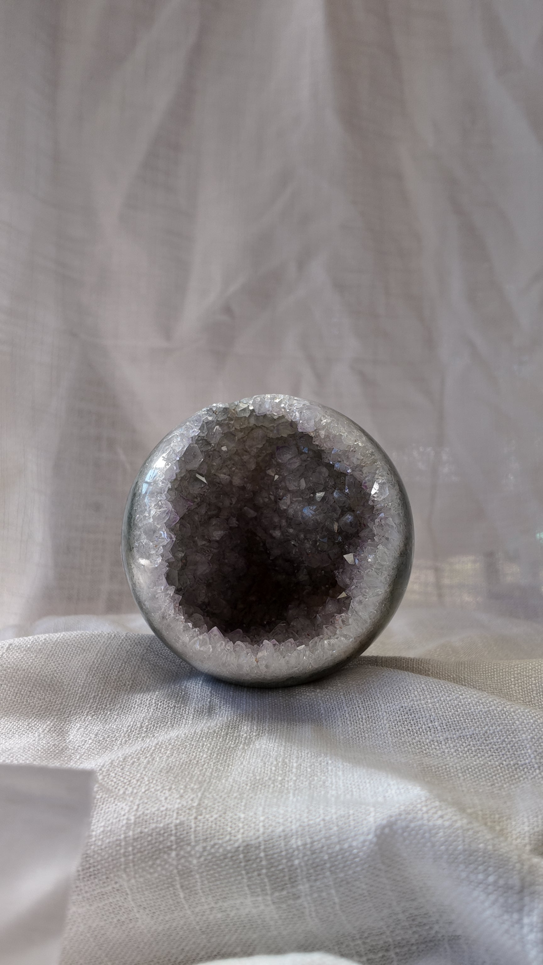 This Grey Amethyst sphere is a unique variation of quartz where the usual violet hues of Amethyst appear softened into silvery greys to blacks. The color is caused by trace amounts of iron within the crystal lattice, combined with natural irradiation over millions of years. Absolutely a collector piece ~