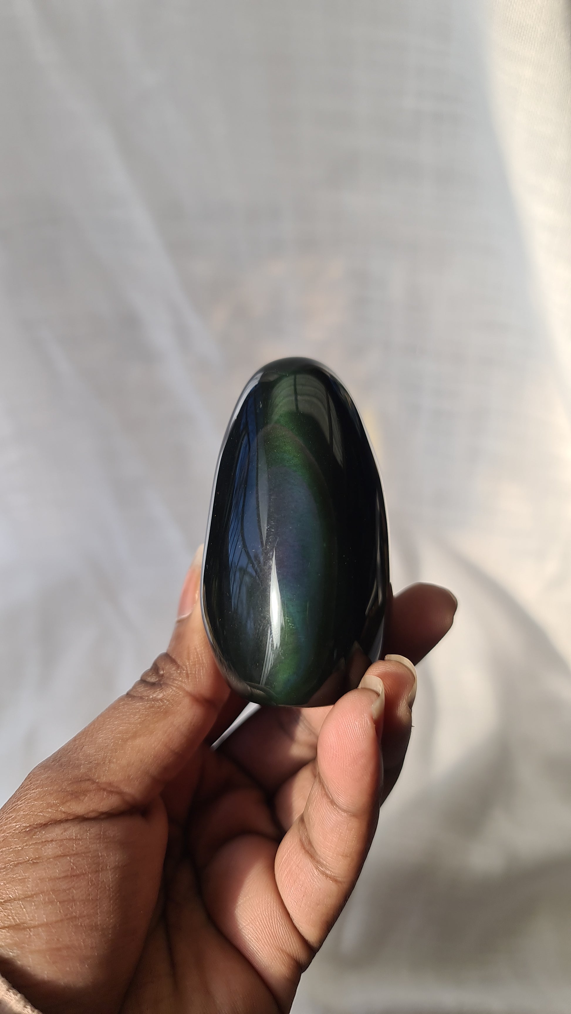 Rainbow Obsidian is a volcanic glass formed from rapidly cooled lava, naturally free of crystal growth. Its deep black base is layered with subtle iridescent bands that shimmer in reds, greens, and golds when the light hits just right. These colors appear due to microscopic inclusions and internal layering that diffract light, giving each piece a hidden rainbow glow. Each stone is completely unique, a sleek and striking example of nature’s artistry captured in volcanic glass.